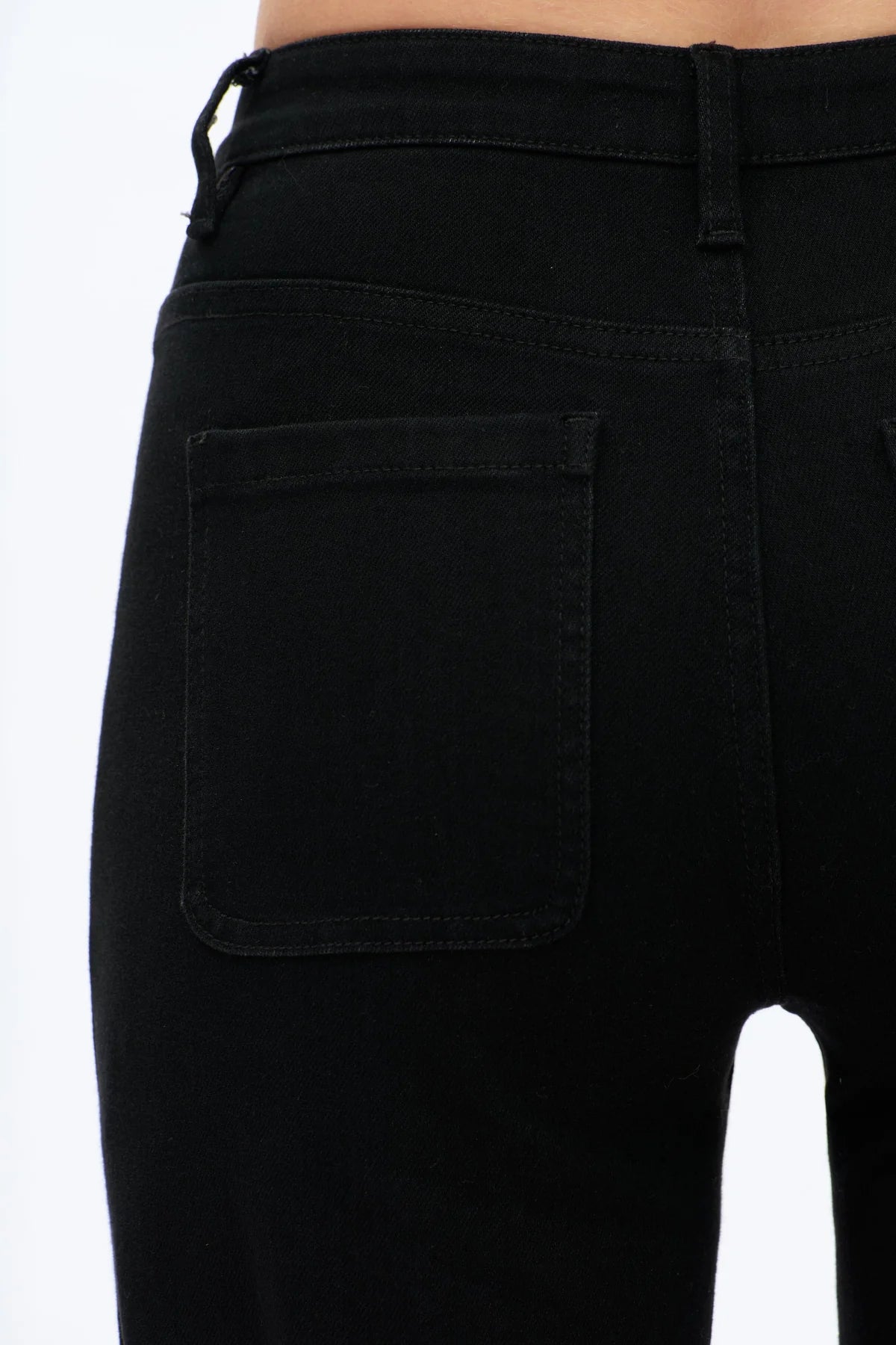High rise sequin wide leg jeans with a black wash, featuring sequin embroidery at the hems. The front includes two square pockets, enhancing leg shape and lengthening the appearance of the legs.