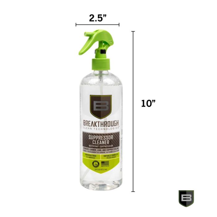 The Breakthrough Clean Technologies® Suppressor Cleaner is a water-based, ammonia-free, cleaner that removes heavy carbon and lead deposits. Utilizing a proprietary blend of chemical surfactants and detergents, Suppressor Cleaner effectively works to neutralize all corrosive residues preventing damaging rust and corrosion without etching or harming your suppressor. With no noxious fumes or hazardous chemicals, Suppressor Cleaner is a safe and effective choice when it comes to removing stubborn carbon & lead build-up in your suppressor. There are a variety of ways to clean a suppressor based on the construction. Some suppressors can be disassembled, but many cannot. Breakthrough Clean Technologies® Suppressor Cleaner has been refined using modern chemistry to tackle this difficult task. It has been rigorously tested by Breakthrough Clean Technologies® and suppressor manufacturers with impressive results. The recommended cleaning process is submersion in the Suppressor Cleaner. The duration needed depends on the cleanliness of the suppressor. If you are cleaning on a regular schedule that coincides with the cleaning of the firearm, it could be leaving the suppressor in the cleaner for as little as one hour. However, if cleaning the suppressor after multiple significant shooting sessions, it may require soaking for 8-12 hours to get the caked on contaminates to release. After soaking, shoot several rounds (supersonic is recommended) through the suppressor to eject the loosened fouling.