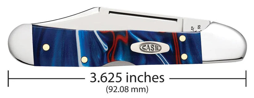 This Mini CopperLock® is a part of the Patriotic Kirinite® Family. No other material has the impactful style and durability of Kirinite®. Smooth but never slippery, Kirinite® bond with your hand gets better after each polishing. Show off your patriotism with this red, white and blue handle! The CopperLock® knife is an original design by W.R. Case that combines elements from the Trapper and Copperhead to make a new lockback knife. The Mini CopperLock® is smaller than the traditional CopperLock® without compromising durability. With a fully locking Clip blade, this Mini CopperLock® knife has the cutting power of a lockback, with the look and feel of a traditional Case pocket knife. The Clip blade is commonly used as a multi-purpose blade that makes this pocket knife great for everyday use. This knife is constructed with Case Tru-Sharp™ stainless steel which is a special high-carbon steel that helps the blades hold an edge longer than conventional steel. It also offers extraordinary blade strength and corrosion resistance. Comes conveniently packaged in a box. Made in Bradford, PA, USA from domestic and imported materials.