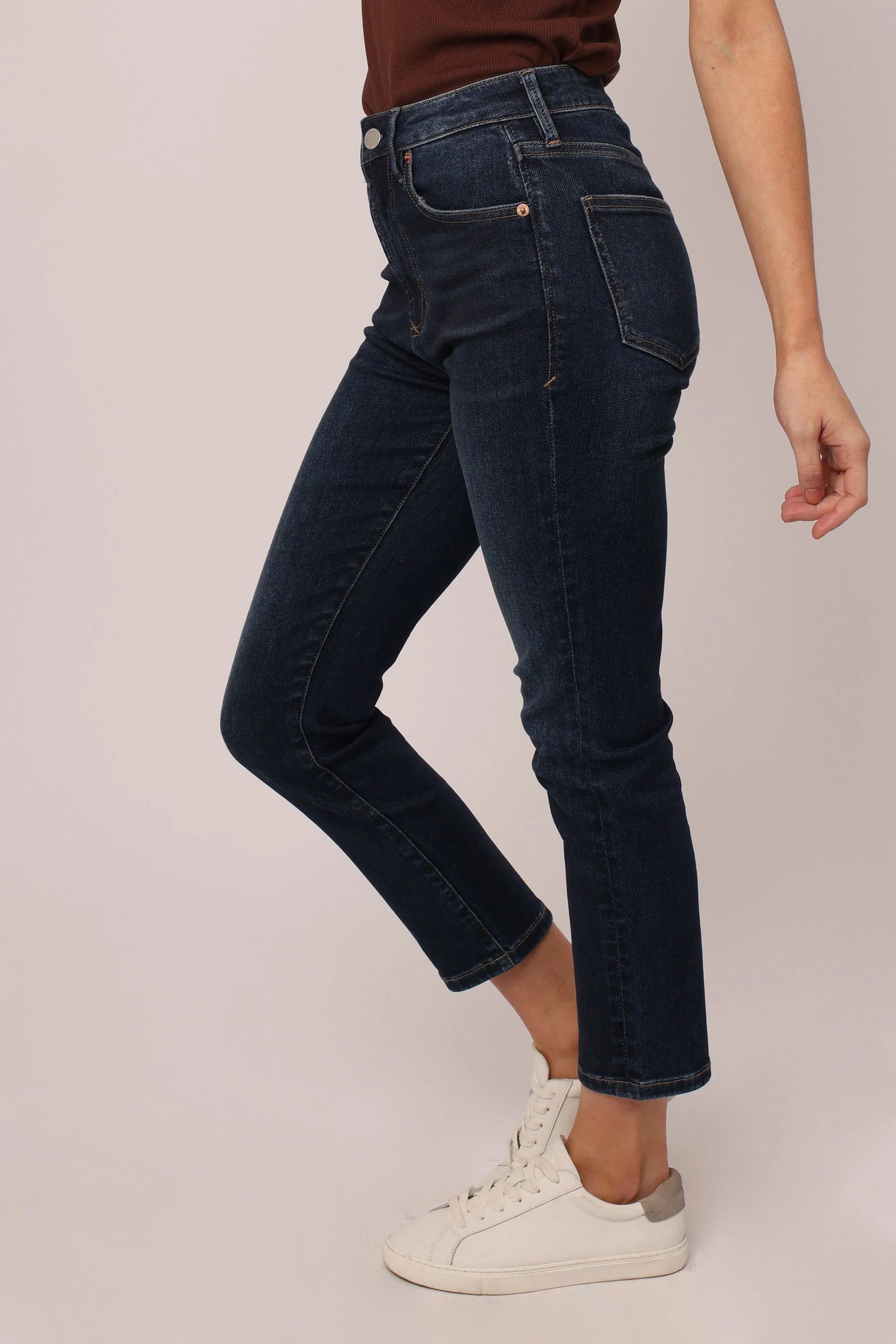 Experience the ultimate in comfort and style with our slim straight leg jeans, designed with a high rise that sits at your natural waist. This groovy fit gently hugs your hips and thighs, tapering lightly down to the ankle. Crafted from comfort stretch denim, these jeans feature a cropped inseam and are enhanced with hand-sanded whiskers at the hip, subtle abrasions, and easy grindings on the pockets and leg openings. The rich indigo shade offers a timeless appeal you can wear for any occasion.
