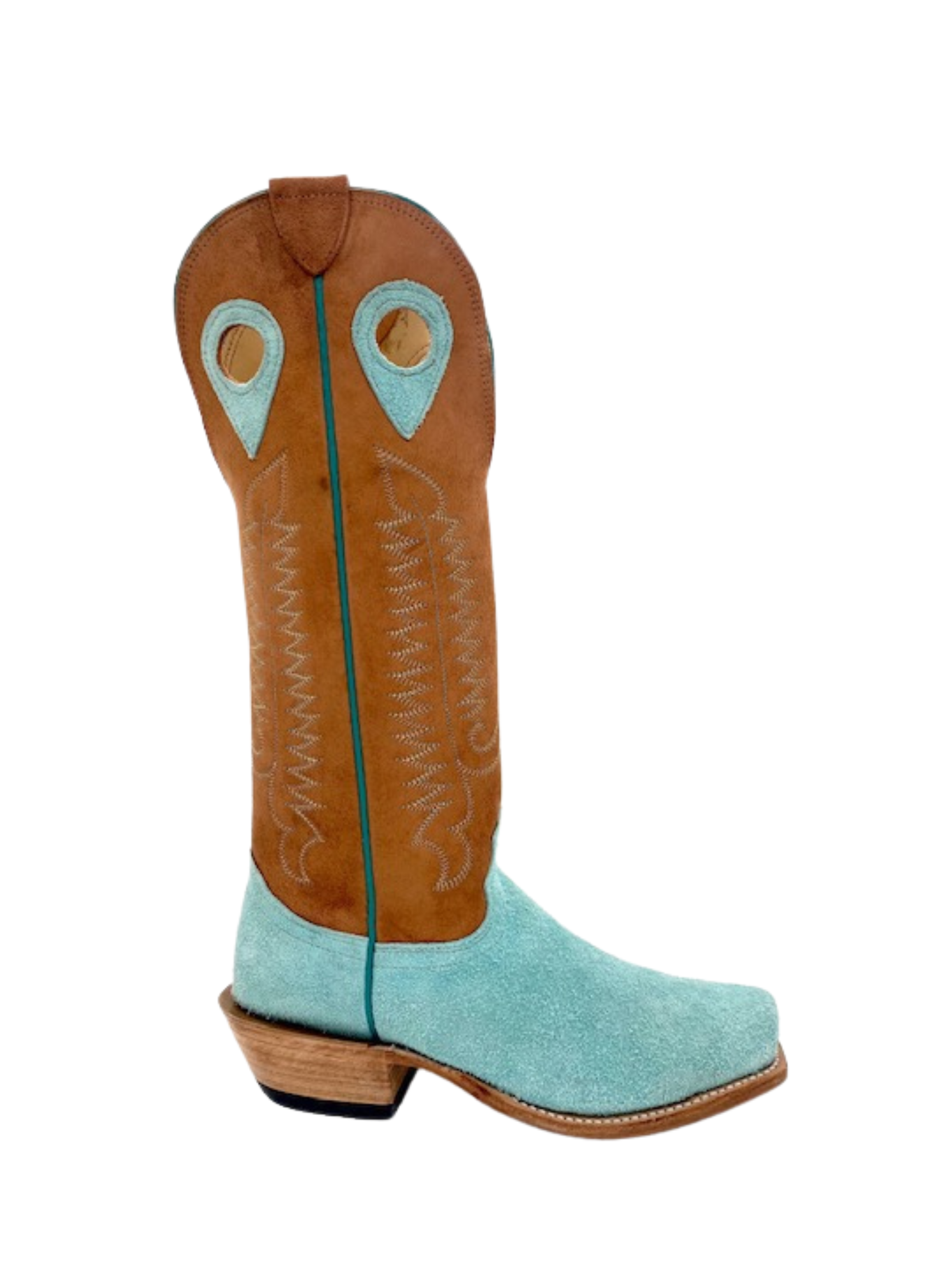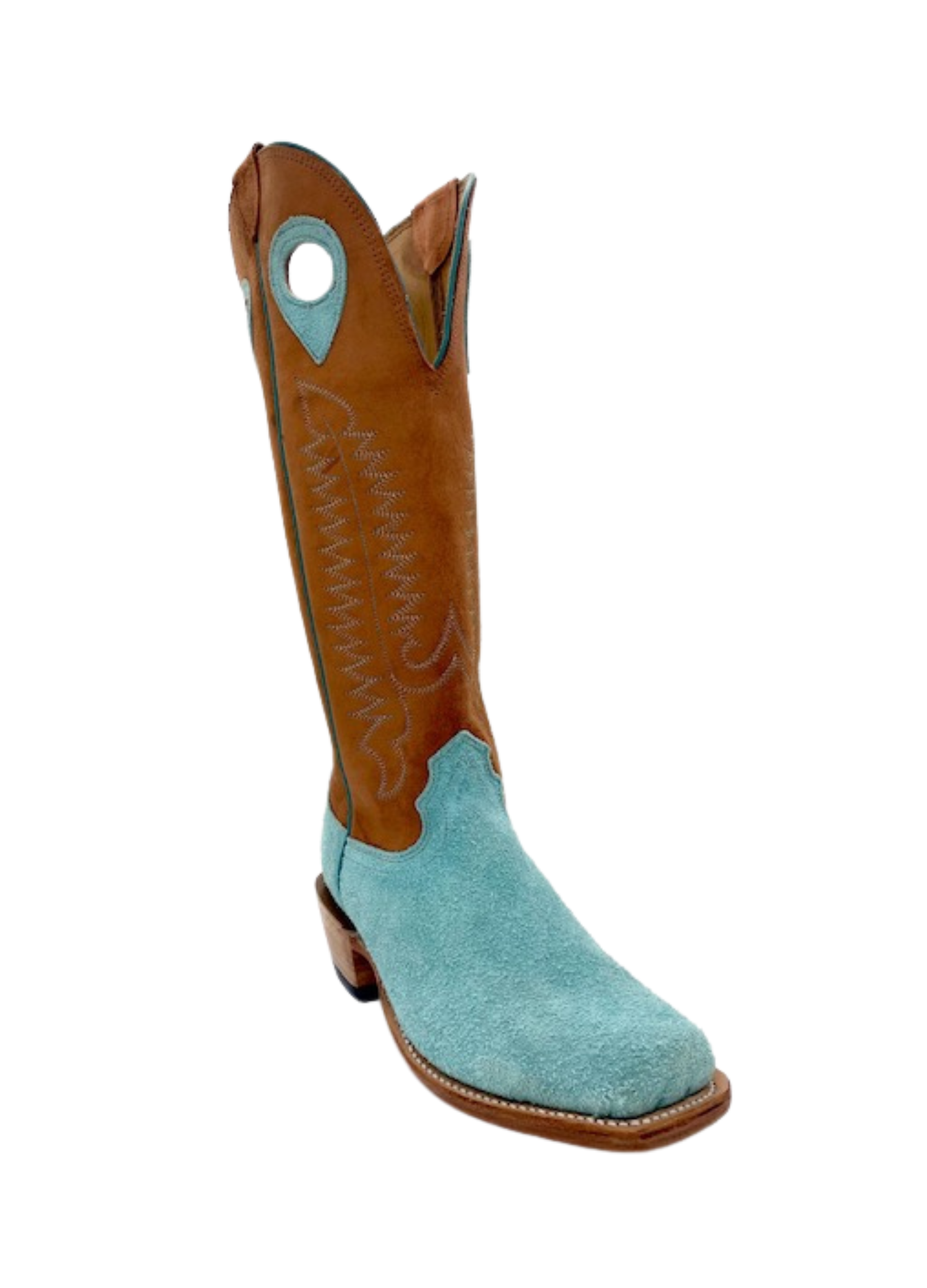 The Fenoglio Tiffany Blue Roughout with Cognac Full Hide boot features blue and gold detailed stitching with pull hole and a riding heel. This boot also holds a narrow, square toe and a leather outsole.