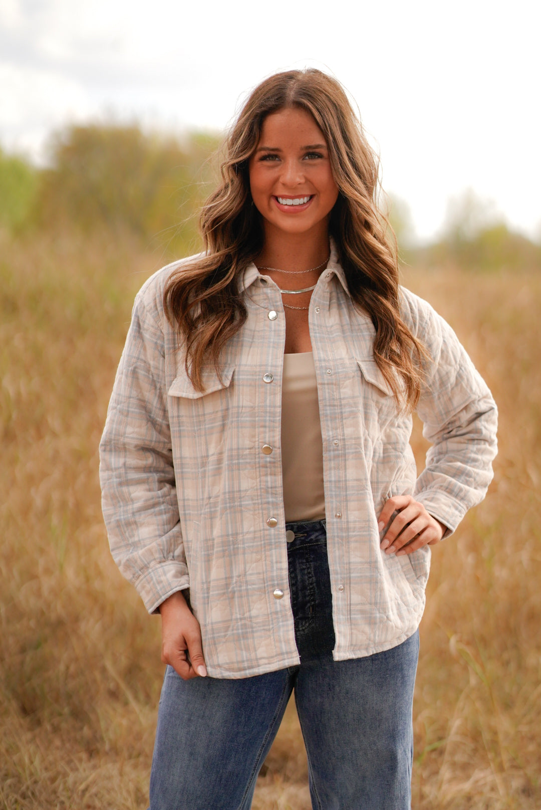 Introducing the Bellaire Quilted Overshirt in Ivory & Blue by Flag & Anthem. This overshirt features a stylish quilted design in dual-tone colors, exuding elegance and sophistication. Crafted with premium quality materials, it offers both style and comfort for a versatile addition to your wardrobe.