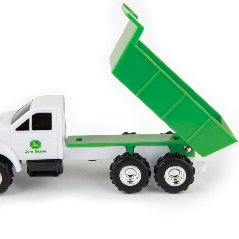 - Toy Tractor and Toy Dump Truck: Both feature free rolling wheels; the truck has a working dump bed and the tractor includes a rear hitch for the included toy wagon for realistic farm play