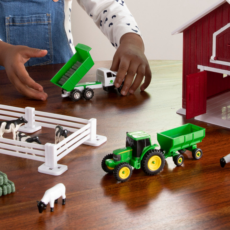 - Farm Toy Set: 24-piece play set of John Deere toys includes barn, truck, tractor with wagon, eight toy animals, 6 fence pieces and 6 hay bales