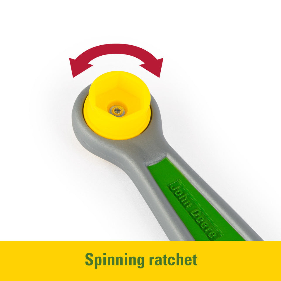 The John Deere Deluxe Talking Tool Belt is the perfect toy tool set for your little fixer-upper! This complete 7-piece set includes a hammer, wrench, screwdriver, pliers, ratchet and tape measure to get the job done just like mom and dad. The adjustable belt features a slot for each tool and an electronic belt buckle with three tool sounds and two fun phrases; “Nothing runs like a Deere” and “It’s time to work on our John Deere tractors!” With these toy tools at your toddler's side, they'll have hours of DIY fun! Requires 3 AAA Batteries (Included).