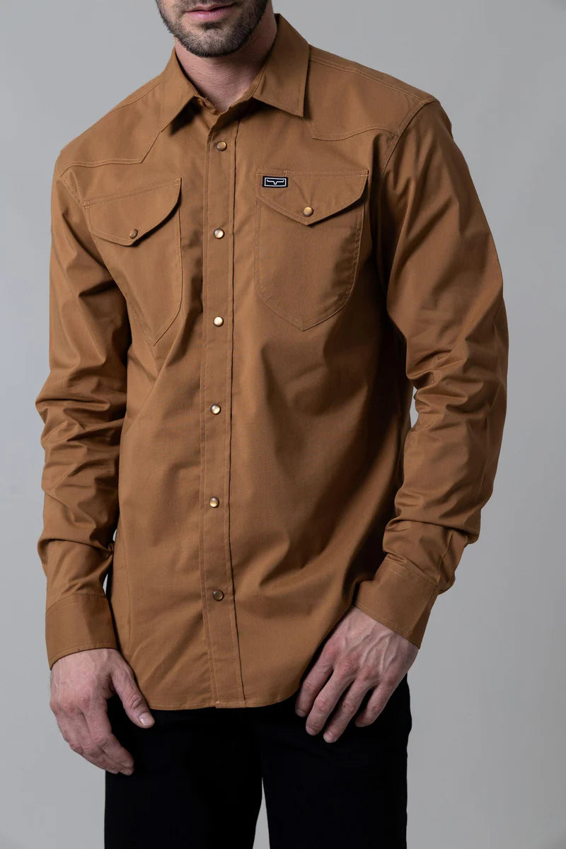 The Blackout features stretch-woven, moisture wicking Coolmax fabric. This piece is solid-colored and full of classic western details like matching pearl snap buttons down the front and closing the two chest pockets, a western yoke, and a collared neckline. The Blackout is the ultimate western work shirt.