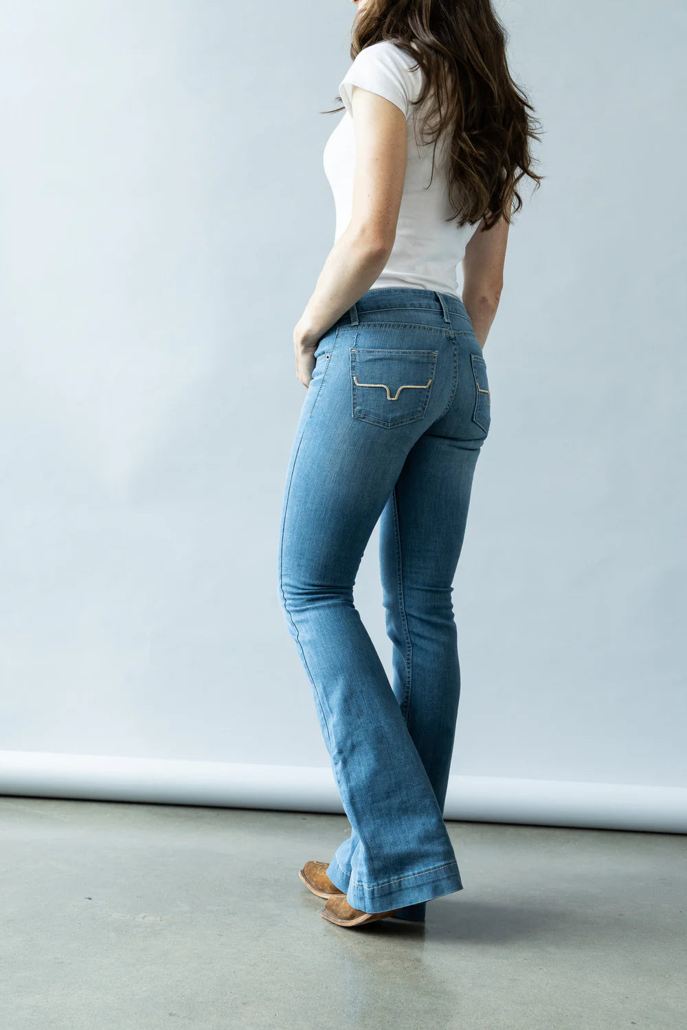 Can't get enough of the Lola? We can't either! Our Lola jeans are in a lighter, hand-sanded wash with a mid-rise and wide flare trouser leg and cuff.