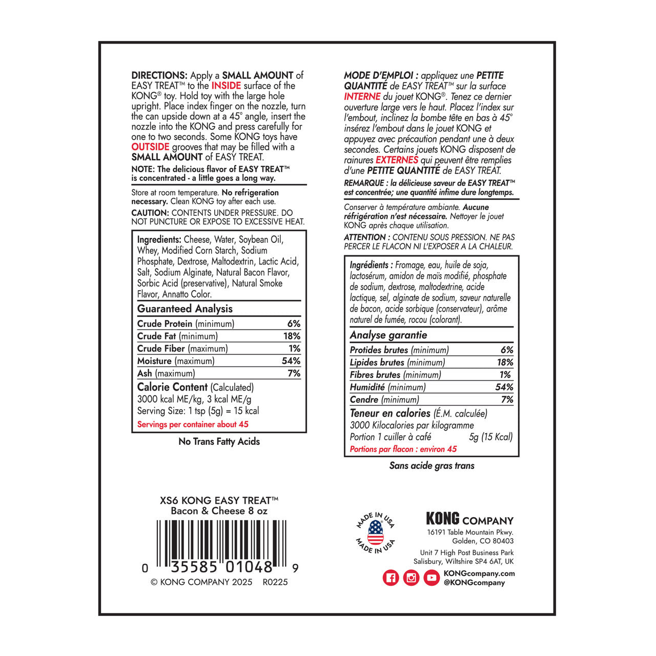 KONG Bacon and Cheese Easy Treat™ is a delicious treat that delights all types of dogs while providing an easy no-mess solution for pet parents. Made in the USA, this highly-digestible and trans-fat free treat is an enticingly delicious addition when added to a stuffed KONG. A uniquely designed nozzle easily controls the amount of KONG Easy Treat™ while also having the added benefit of a convenient, no mess stuffing solution. Want to make your stuffed KONG last longer? Freeze a stuffed KONG, topped with KONG Bacon and Cheese Easy Treat™ for a longer-lasting, mind occupying challenge. No Refrigeration required.