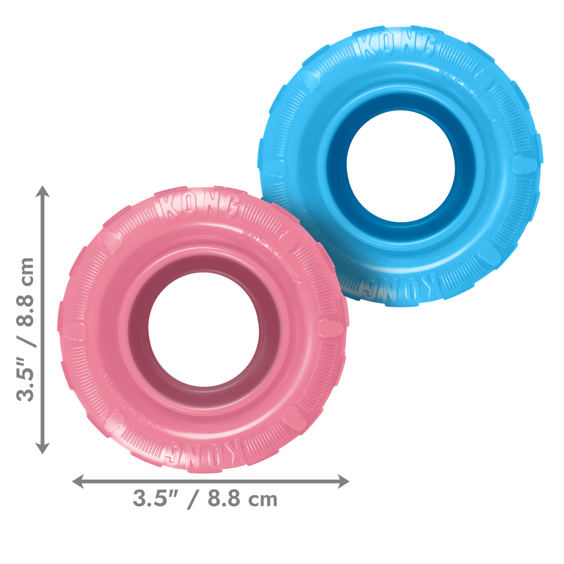 The new KONG Puppy Tire is an extension of the most popular KONG Classic Puppy line. Building on the success of the popular KONG Tires for adult dogs, this toy uses KONG’s exclusive puppy rubber formula specifically designed to ease teething gums. The stuffable inner track creates a mental challenge for puppies while teaching correct chewing habits. Freeze for a greater challenge.
