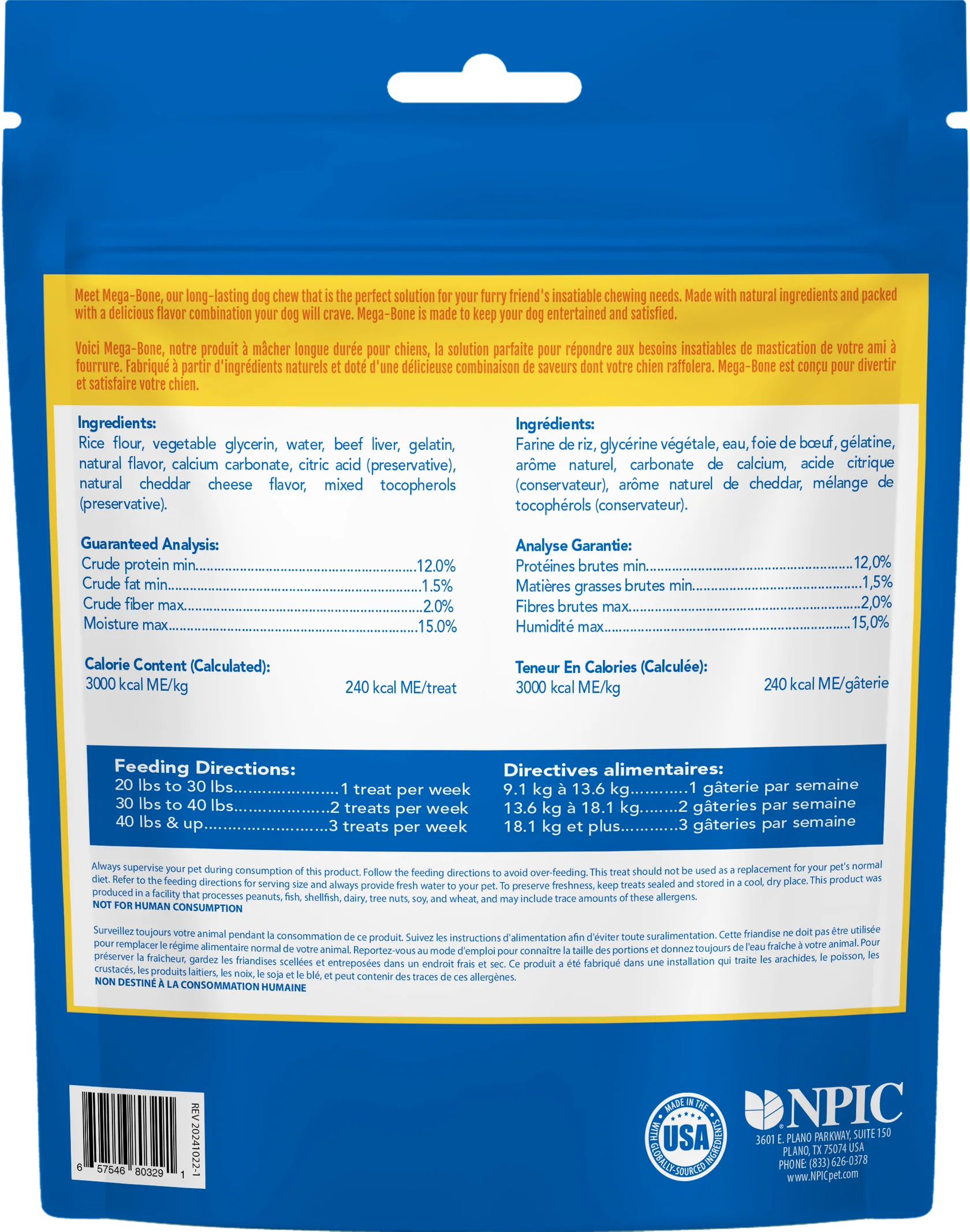 Meet Mega-Bone, our long-lasting dog chew that is the perfect solution for your furry friend’s insatiable chewing needs. Made with natural ingredients and packed with a delicious flavor combination your dog will crave.