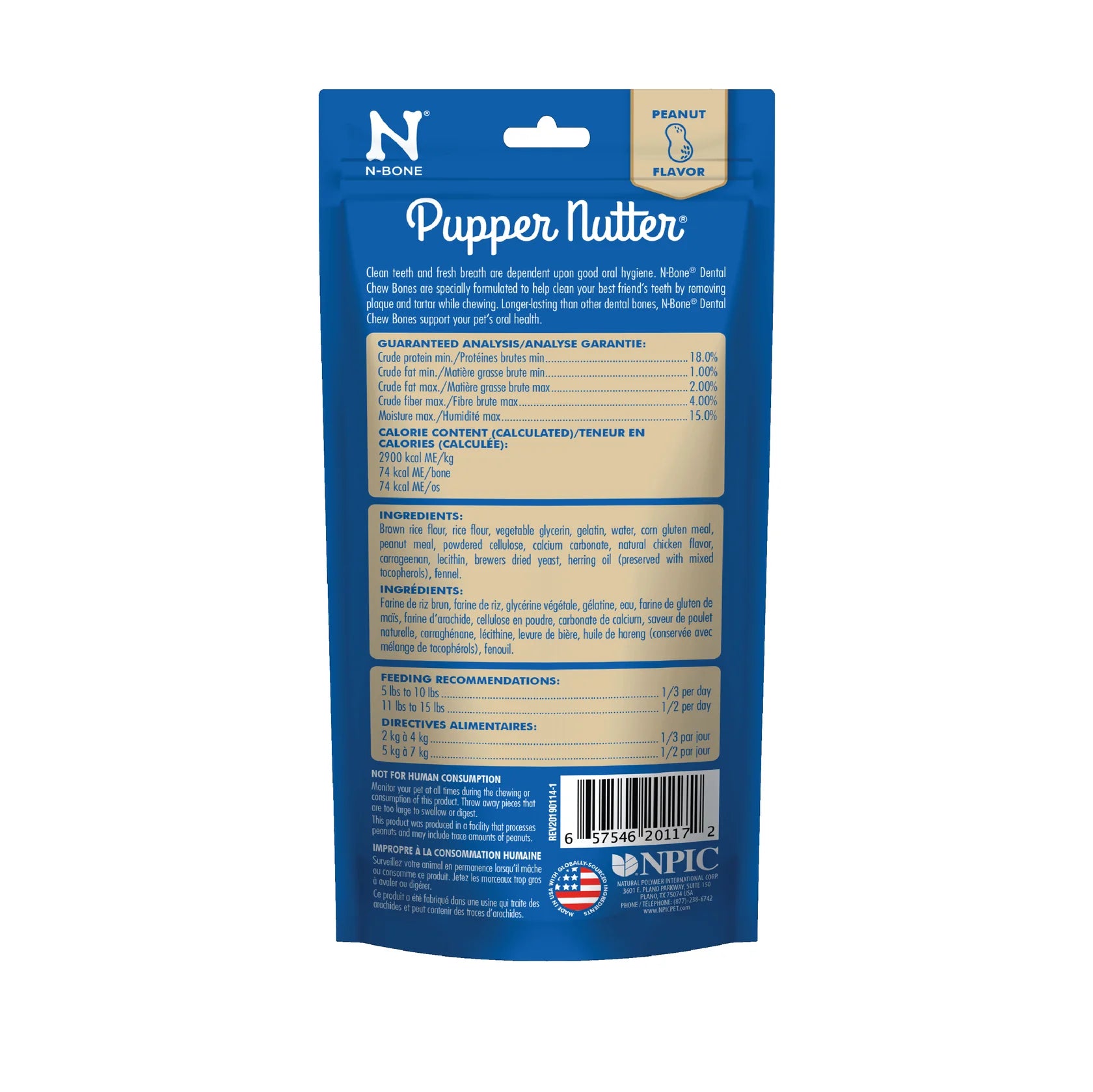 PupperNutter® is an all natural, long-lastingall-natural chew made with the delicious flavor of peanut butter. Its unique texture and specialized formula help freshen breath and reduce plaque and tartar while your dog chews. Since it is low in fat and calories and highly digestible, it’s completely guilt-free! Wheat and soy sensitive pups can chow down as well because N-bone® PupperNutter® is wheat free and soy free. N-Bone® PupperNutter® chew bone for dogs is a satisfying and natural way to ensure excellent oral health, with the irresistibly delicious flavor of peanut butter.