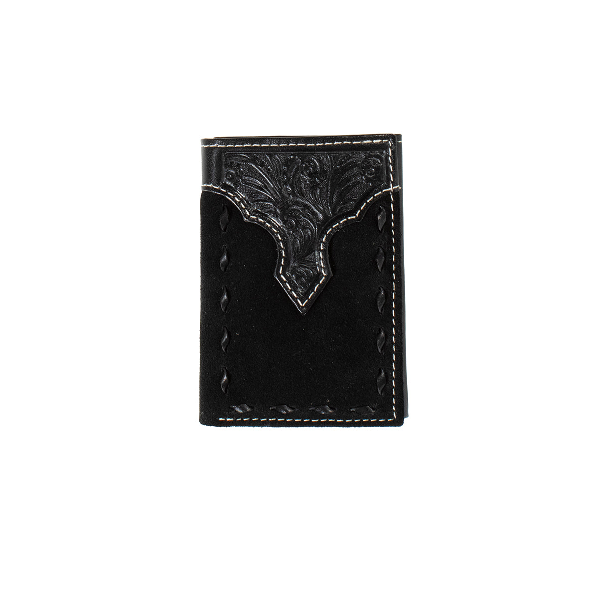 This Nocona trifold wallet by M&F Western Products is genuine leather. Roughout body, with black buck lace stitching down the sides and a floral embossed tab. Card slots and ID window.