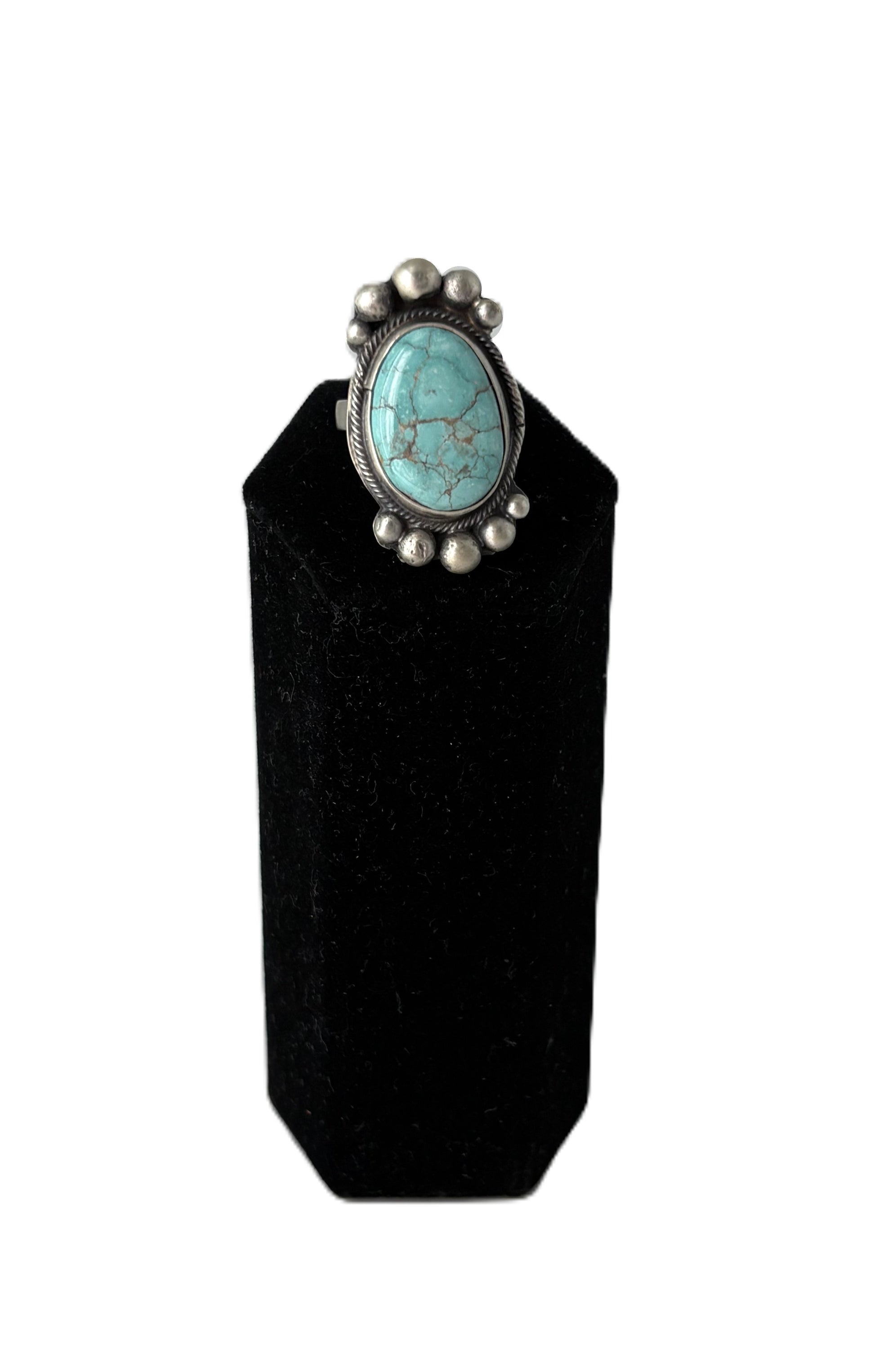 This isn’t your average turquoise ring. The oval stone pops against a frame of striking silver embellishments, giving it rustic character and plenty of personality.