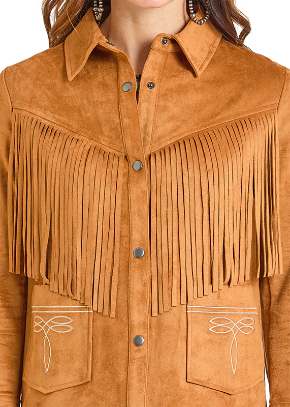 The Micro Suede Fringe Jacket With Boot Stitch Embroidery in combines southwestern charm with modern style. Crafted from 96% polyester and 4% spandex, this jacket features fringe detailing and boot stitch embroidery. The snap closure and long sleeves ensure warmth and a unique look.