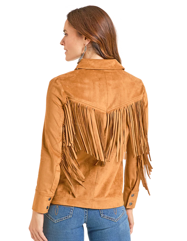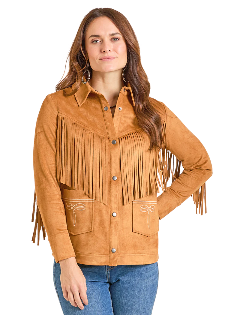 Panhandle Slim Camel Micro Suede Fringe Jacket with Boot Stitch Embroidery