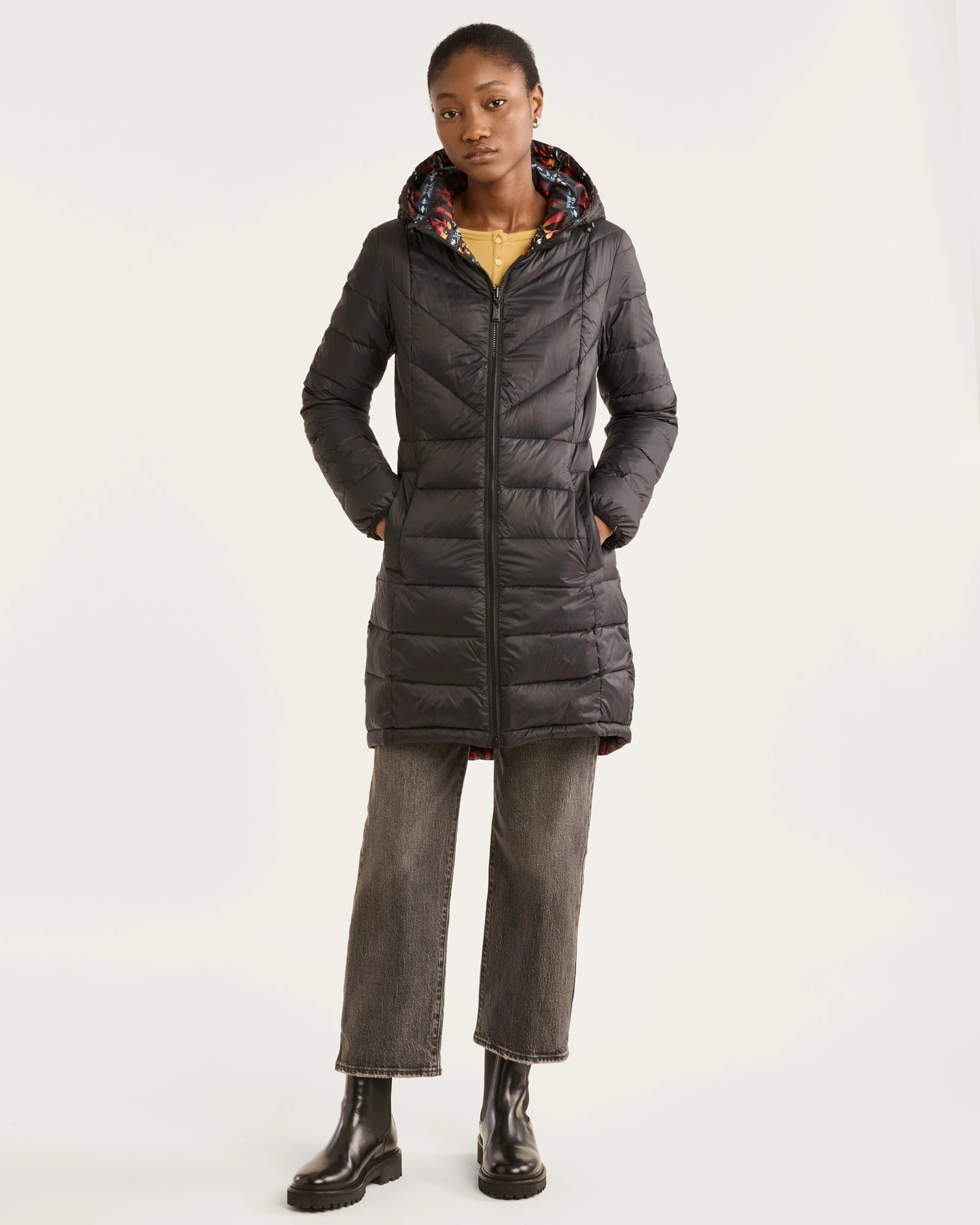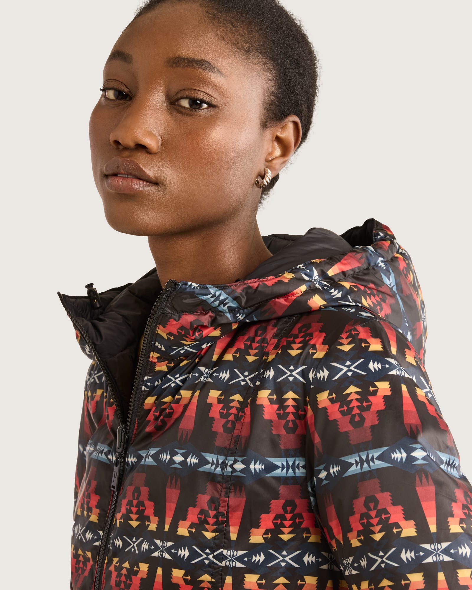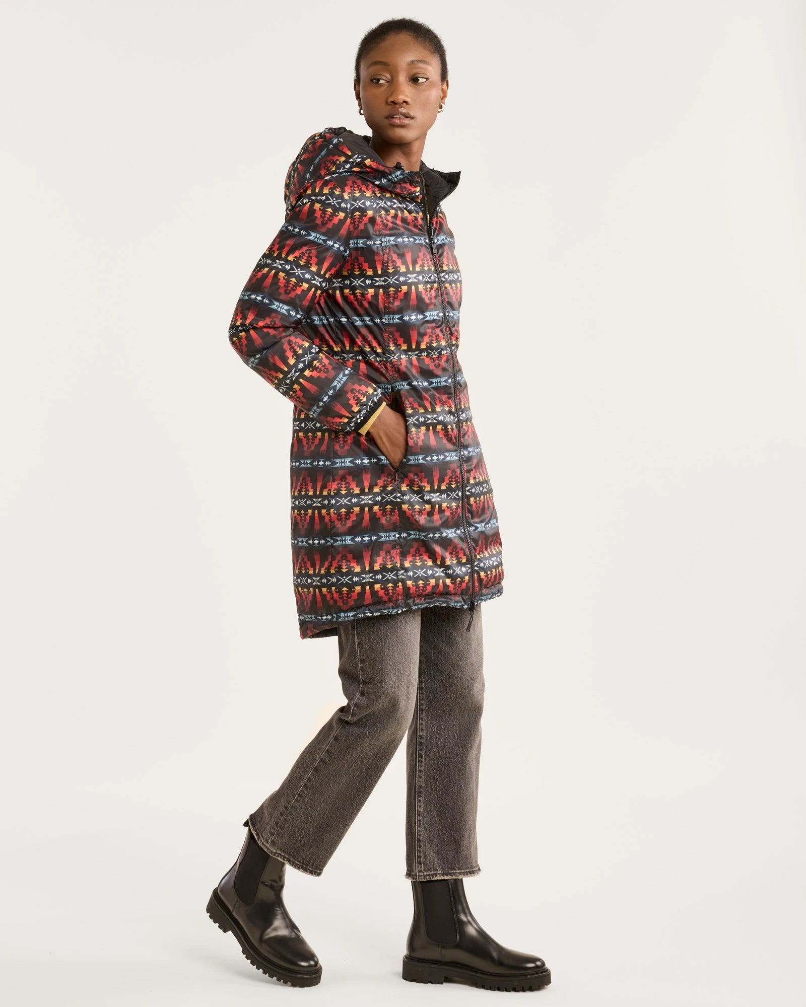 Women's down puffer coat with 400 fill power reversed from a solid color option on one side, to an exclusive Pendleton pattern on the reverse. Thoughtfully designed with a two-way zipper, hood with adjustable bungee drawcord, and invisible zippered pockets on both sides. Includes separate packable bag. Machine wash.