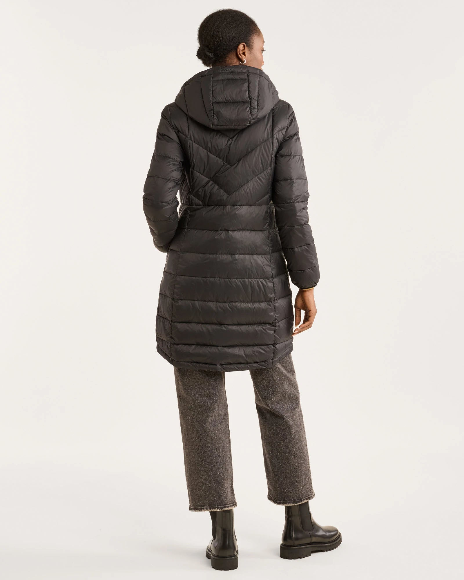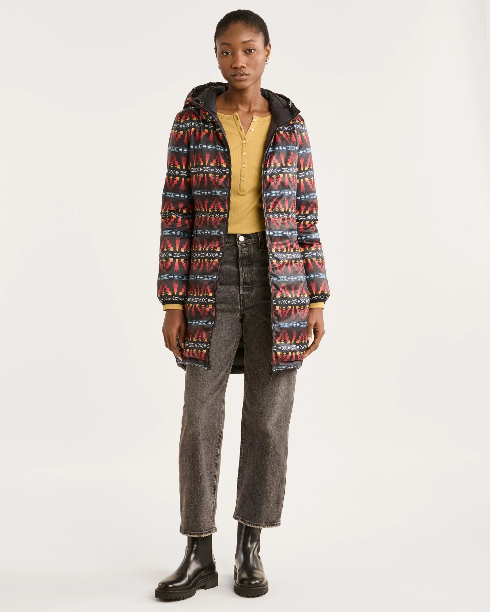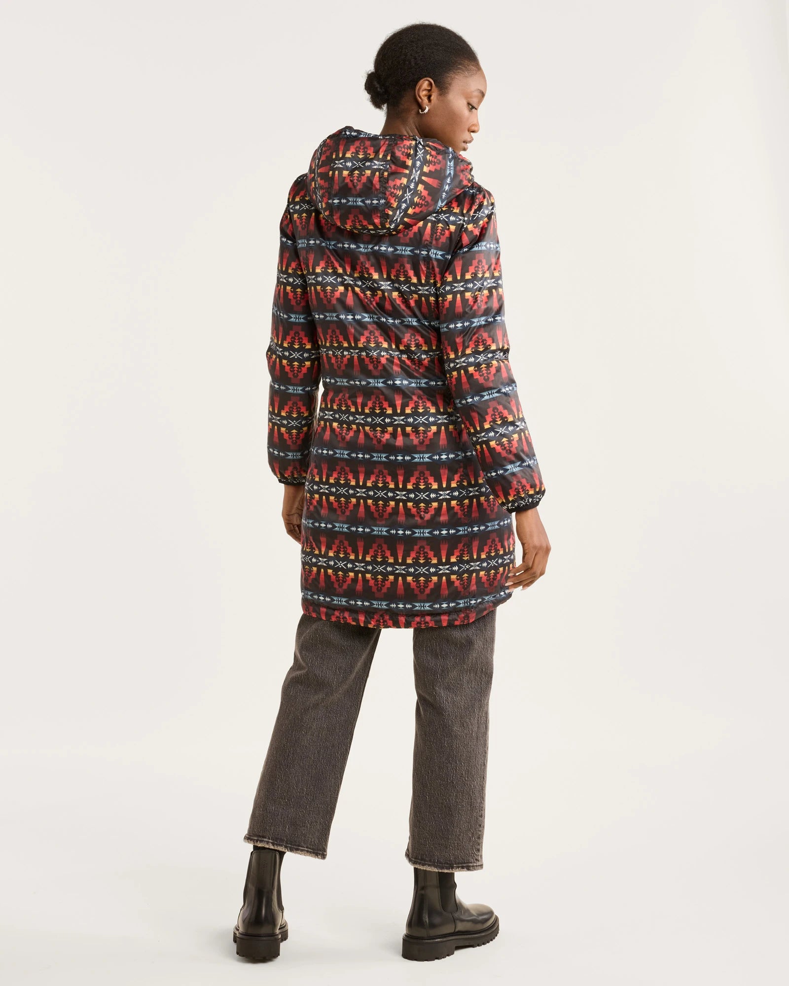Women's down puffer coat with 400 fill power reversed from a solid color option on one side, to an exclusive Pendleton pattern on the reverse. Thoughtfully designed with a two-way zipper, hood with adjustable bungee drawcord, and invisible zippered pockets on both sides. Includes separate packable bag. Machine wash.