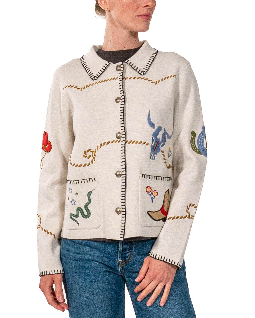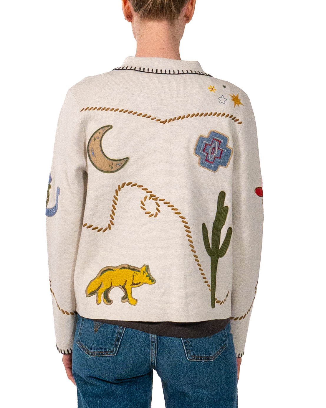 This souvenir cardigan is back with fun new appliquéd symbols of the West – boots, cow skulls, snakes, and more. With two patch pockets, a fold down collar, vintage-inspired silvertone novelty buttons, and contrasting whipstitch accents, this whimsical layer is classic and timeless.
