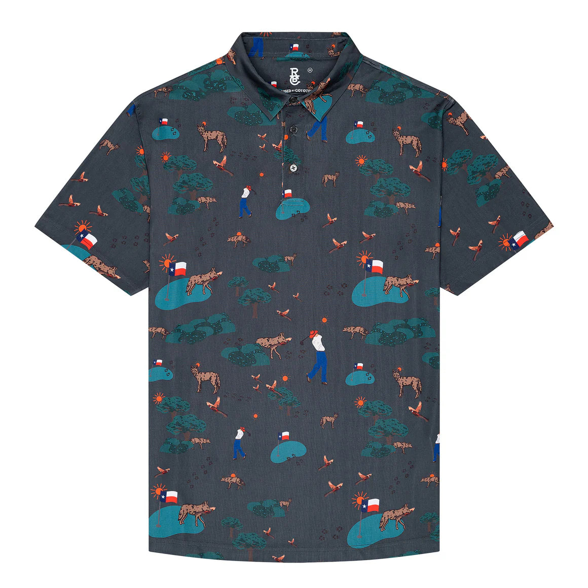 Every Texas golfer knows the feeling—you’re halfway down the fairway, sun’s beating down, and a coyote’s watching from the rough. The Coyote Country Club Polo celebrates that moment with a fun design featuring coyotes and birds roaming a Texas golf course. Crafted with our lightweight, breathable TexFlex fabric, it’s built for long rounds, warm days, and those who’ve earned their place in the wildest country club around. If you’ve ever spotted a coyote on the course, congratulations—you’re already a member.