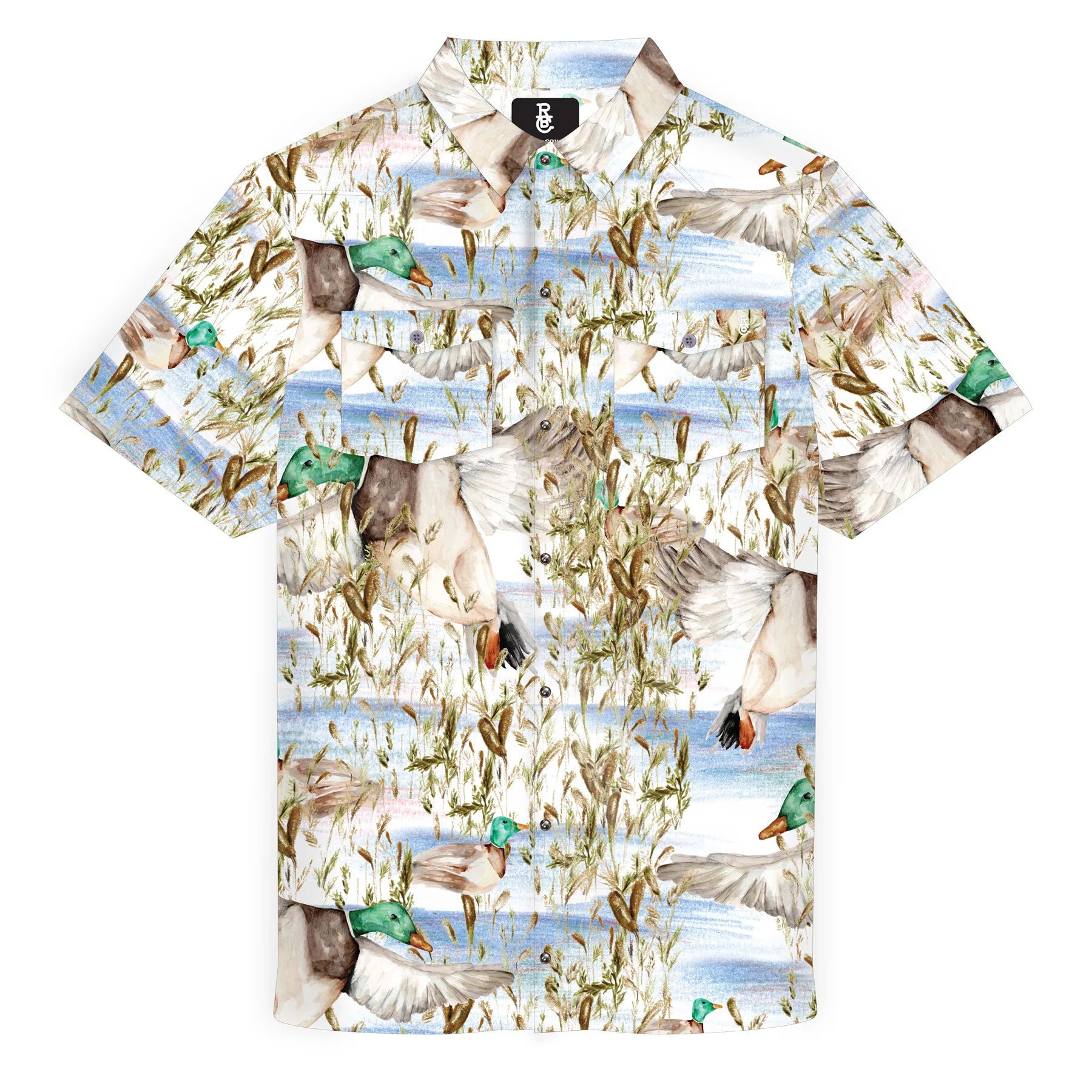 Our Mallard duck pearl snap western shirt features a hand painted pattern, pearl snap button down, and embroidered RBC iron brand on the front pocket.