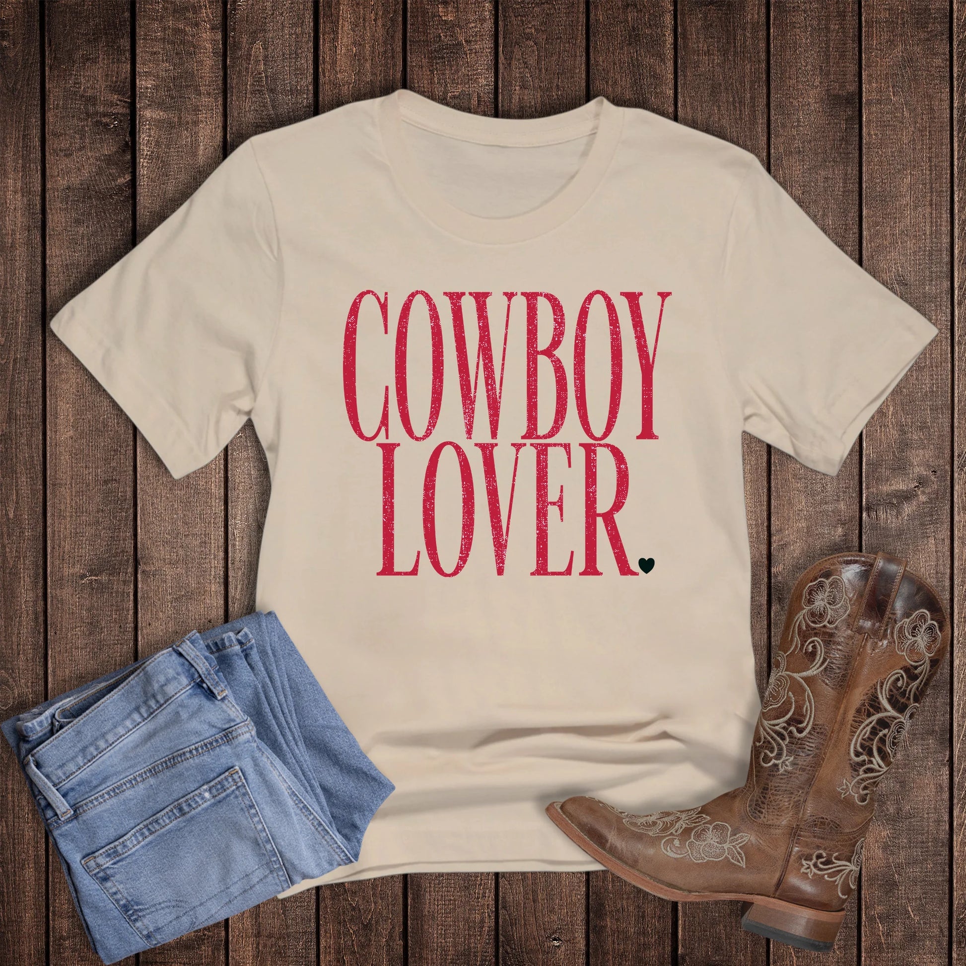 Saddle up, sweetheart. The Cowboy Lover tee brings all the western charm with bold red lettering and a little heart to seal the deal. Soft, easy to style, and made for rodeo nights or denim days — just add boots and go.