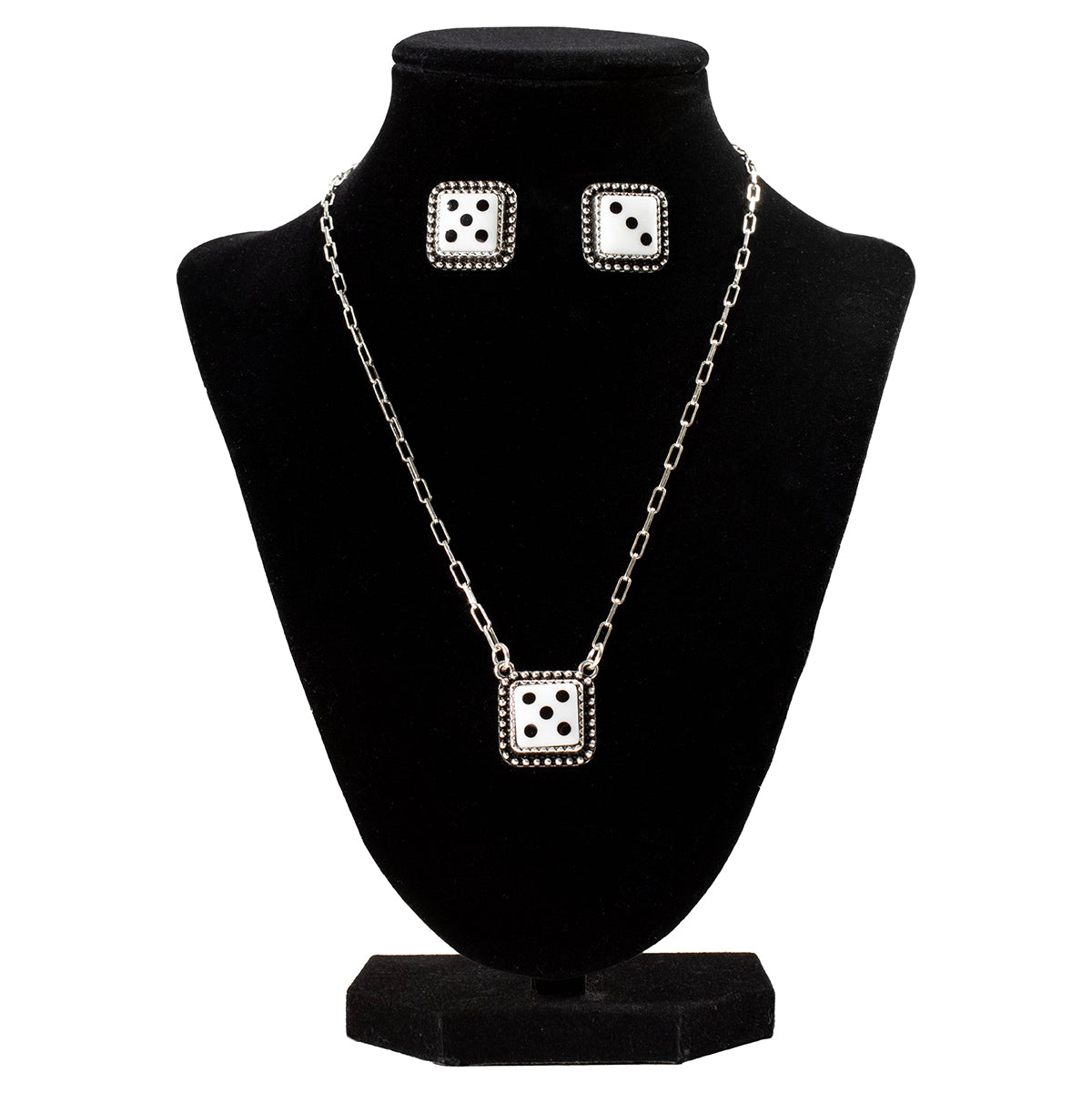 Fashionable Silver Strike necklace and earring set by M&F Western Products. Resin dice pendant on a silver chain. Matching earrings on post.