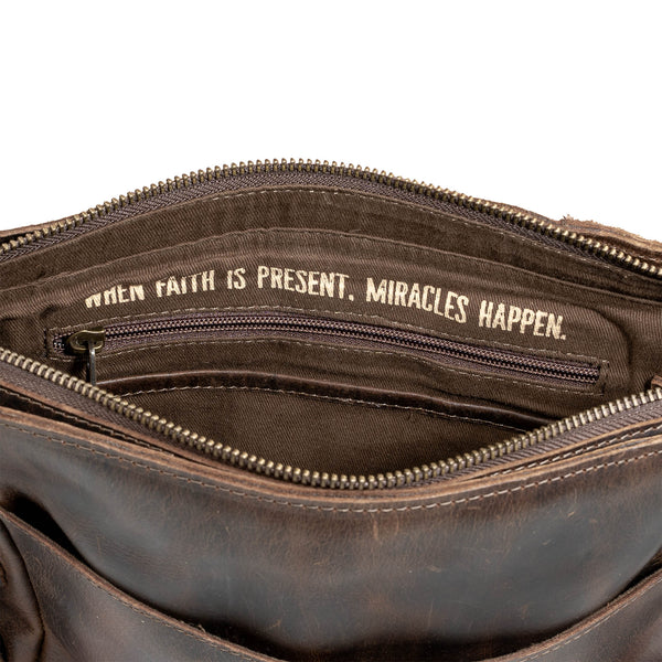 The Guadalupe Serape Olivia Crossbody captures the essence of fall with its rich palette of browns, creams, grays and black colors and is crafted from hand-woven cotton with full grain leather accents for a timeless rustic charm.