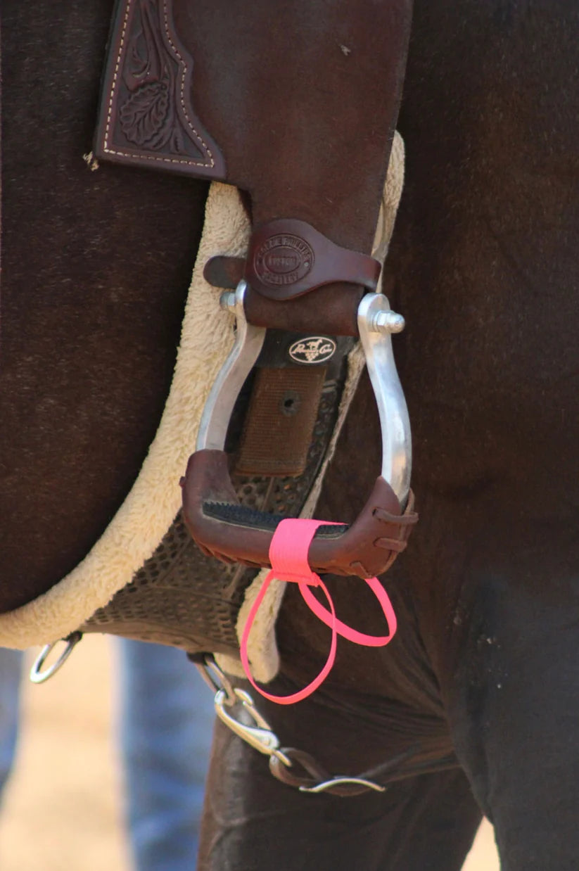 This device is designed to secure barrel racers feet in their stirrups, while also allowing a safe escape in the event of an emergency. The bands can be attached to a stirrup using the safety release buckle and remain on the stirrup for continued use. The elasticity of the band allows them to fit riders of various different boot, and stirrup sizes!