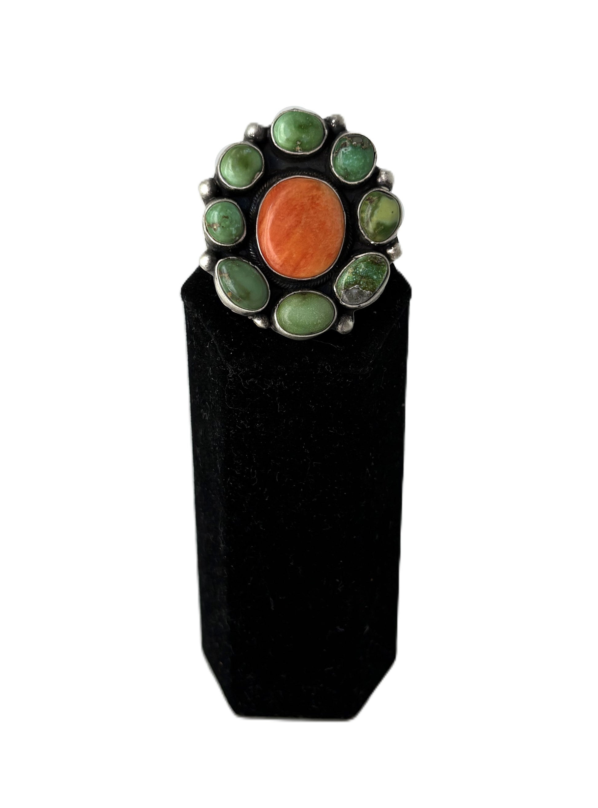 This statement ring brings together cool turquoise and warm spiny oyster in a bold cluster that feels both earthy and intentional. The rich orange center stone draws the eye immediately, while the surrounding turquoise adds depth, balance, and natural texture. Each stone carries its own variation, giving the ring a one-of-a-kind feel.