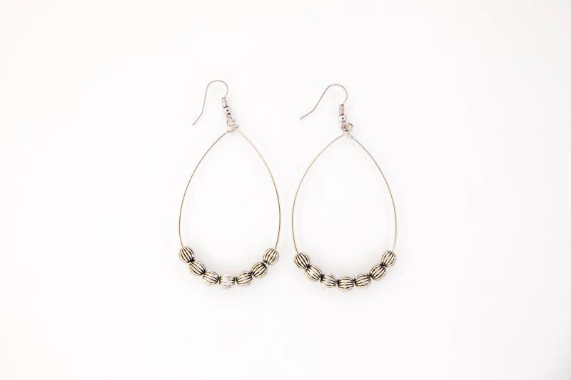 These 3" teardrop earrings feature 18k white gold-plated wire elegantly shaped on fishhook backs, providing a comfortable and secure fit. Delicate melon bead accents add subtle texture and charm, making them a versatile accessory for both everyday wear and special occasions.