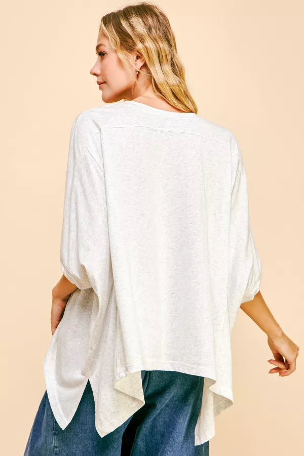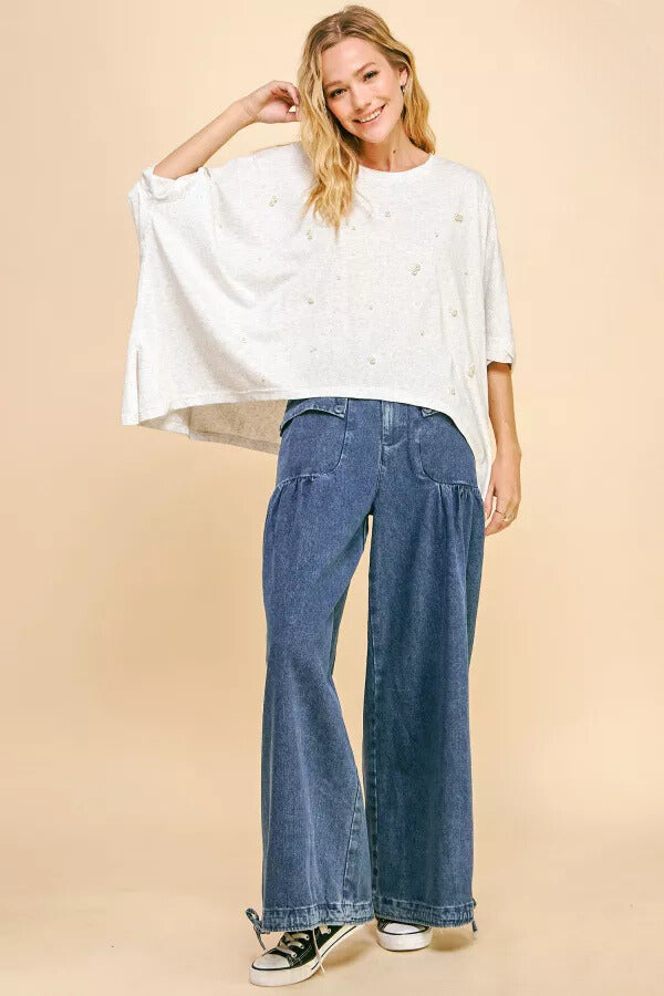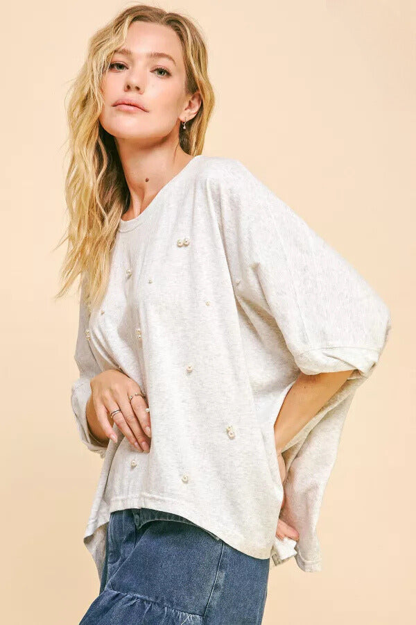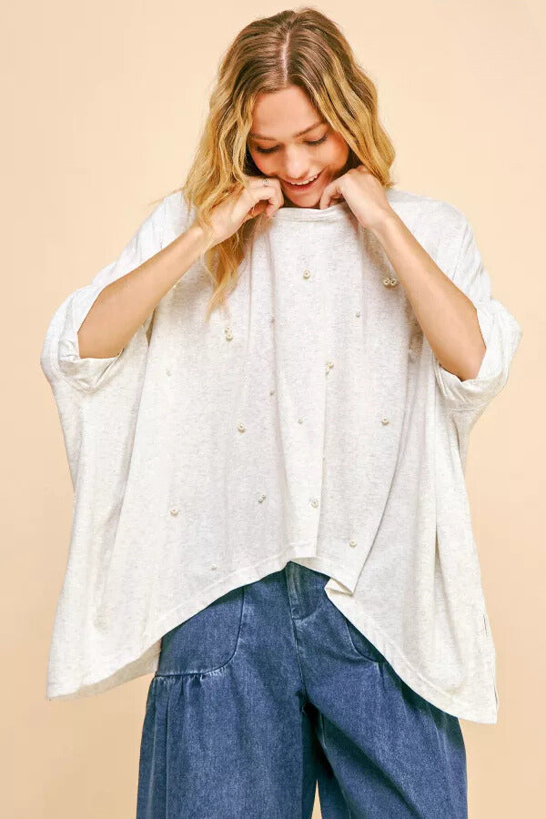 Women's Curvy Pearl Embellished Round Neck Drop Shoulders Batwing Sleeve Side Slit Loose Fit Top